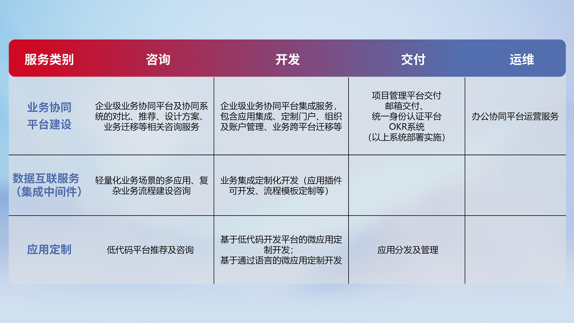 针对钉钉、、企微、、IDaas等平台级产品提供产品的规划、、方案、、、、交付、、、定制化开发等服务,,,,实现如统一协同办公、、智能客户服务、、、混合会议管理、、、智能数据查询、、等业务场景,,,,实现数字化转型。。。