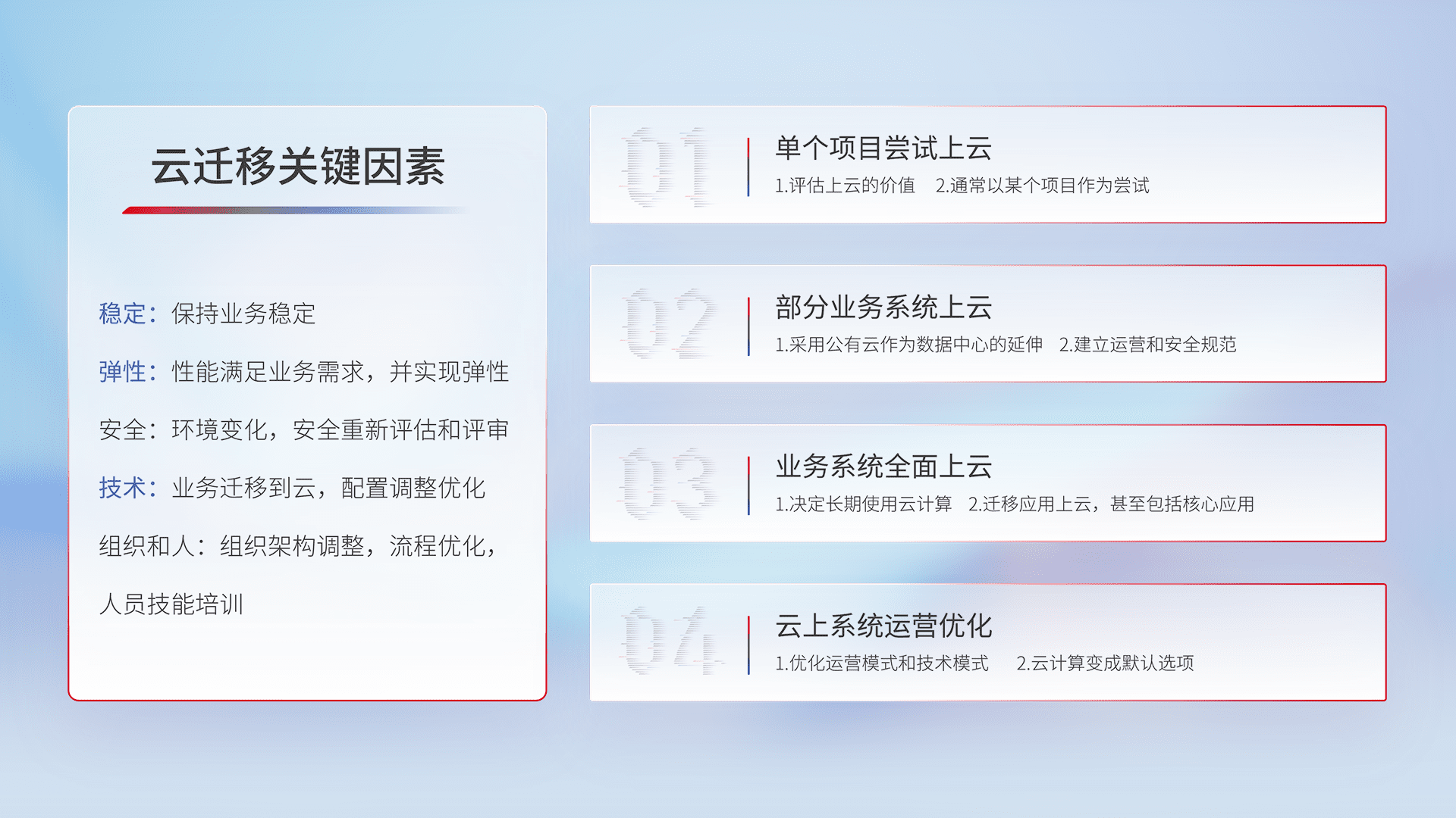 结合实际业务,,,,从规划设计、、、云平台选型、、、云原生改造、、、数据迁移、、、集成交付,,,迁移全过程为客户识别最佳上云路径,,做好风险识别管理,,,,设计网络架构、、、、身份权限、、、安全审计合规、、、操作审计、、、日志审计、、、、监控告警策略、、、、多站点容灾设计等,,,,对云上基础设施进行整体规划,,,提升IT治理水平,,,以满足弹性、、高可用、、、、高性能的需求。。。