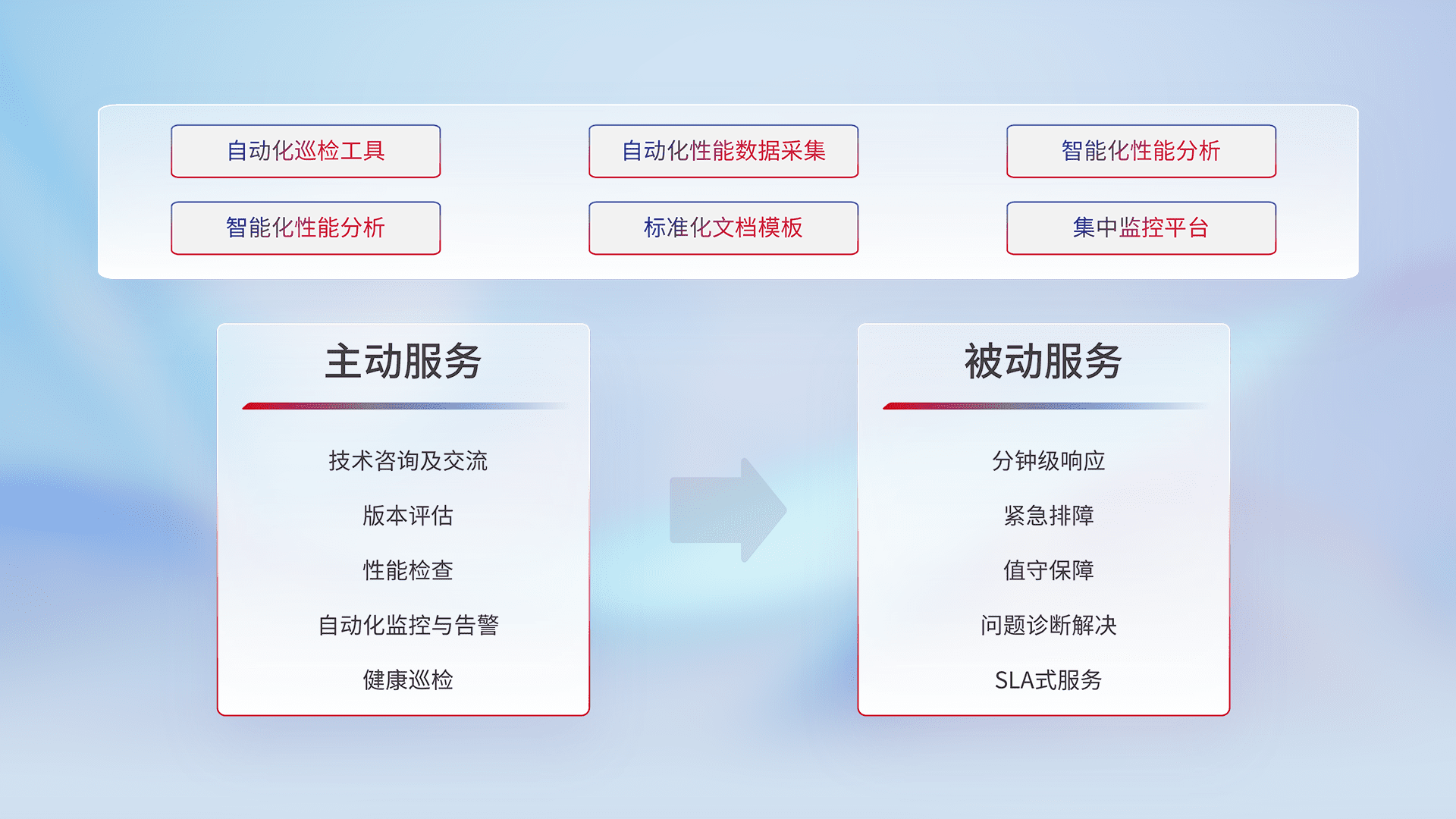 智能化工具和标准化文档,,,,保障服务质量,,提供主动服务(包含技术咨询、、、、版本评估、、性能检查、、、自动化监控与告警、、、健康巡检)和被动服务包含(分钟级响应、、、、紧急排障、、值守保障、、、问题诊断解决、、SLA服务)。。
